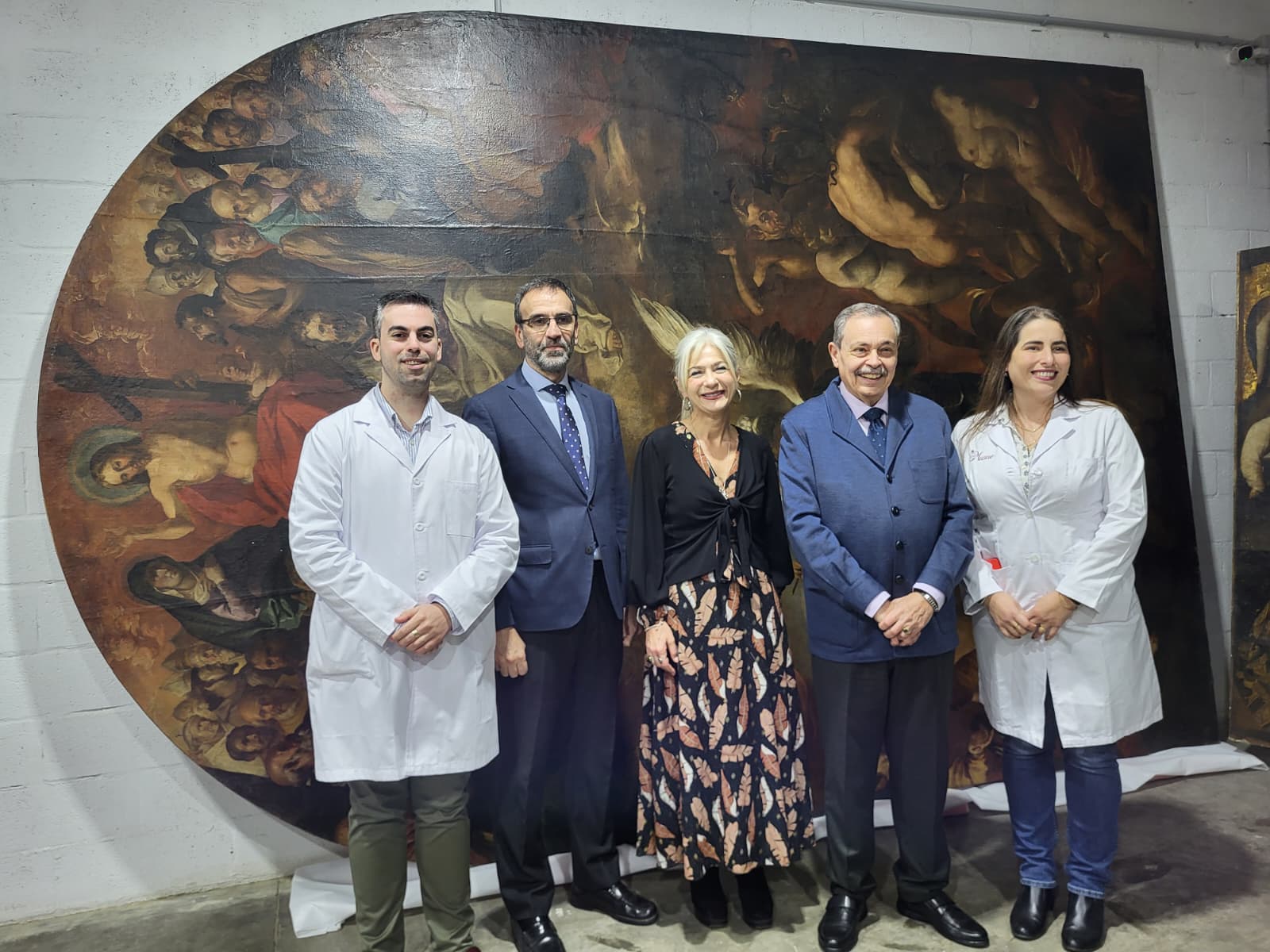 La consejera de Cultura de la Junta de Andalucía, Patricia del Pozo, acompañada por el hermano Mayor de San Bernardo, José García, ha visitado las instalaciones de Musae para comprobar los trabajos de restauración del retablo ’El Juicio Final’.